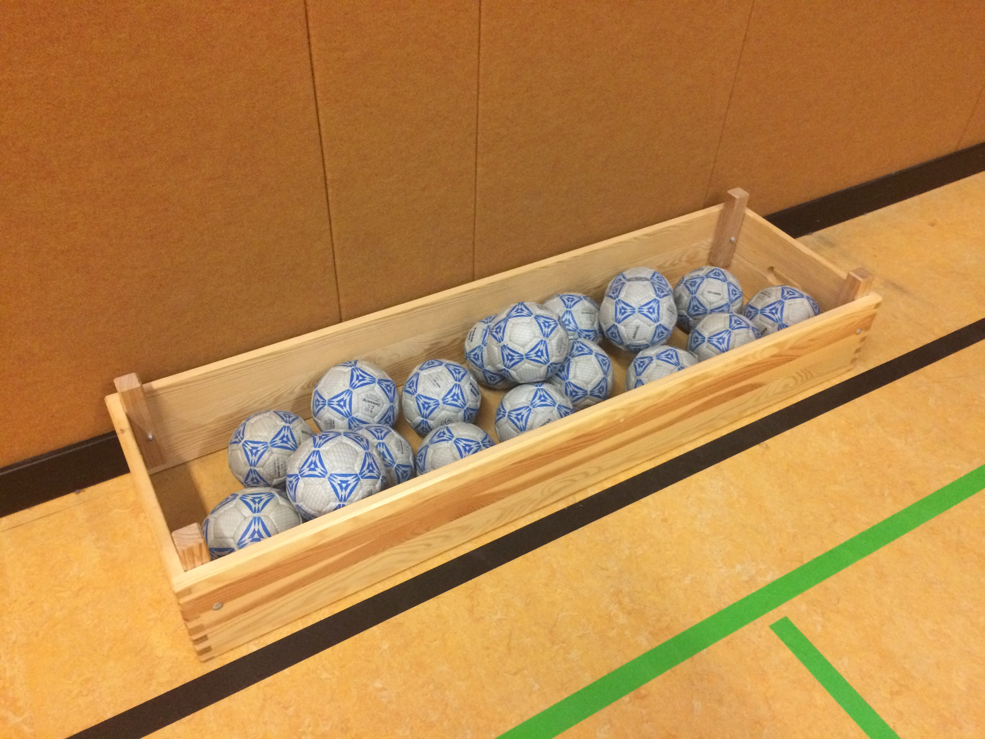 - Tip: Da man das Spiel in der Regel vor dem Trainingsbeginn aufbaut und die Kinder bis zum Beginn der Spielstunde in der Halle herumtoben ist es empfehlenswert, auf die mittleren Kastenteile jeweils ein oberes Kastenteil (die mit dem Lederbezug) zu legen. So sehen die Kinder die Bälle nicht gleich und sie bleiben im Kasten.